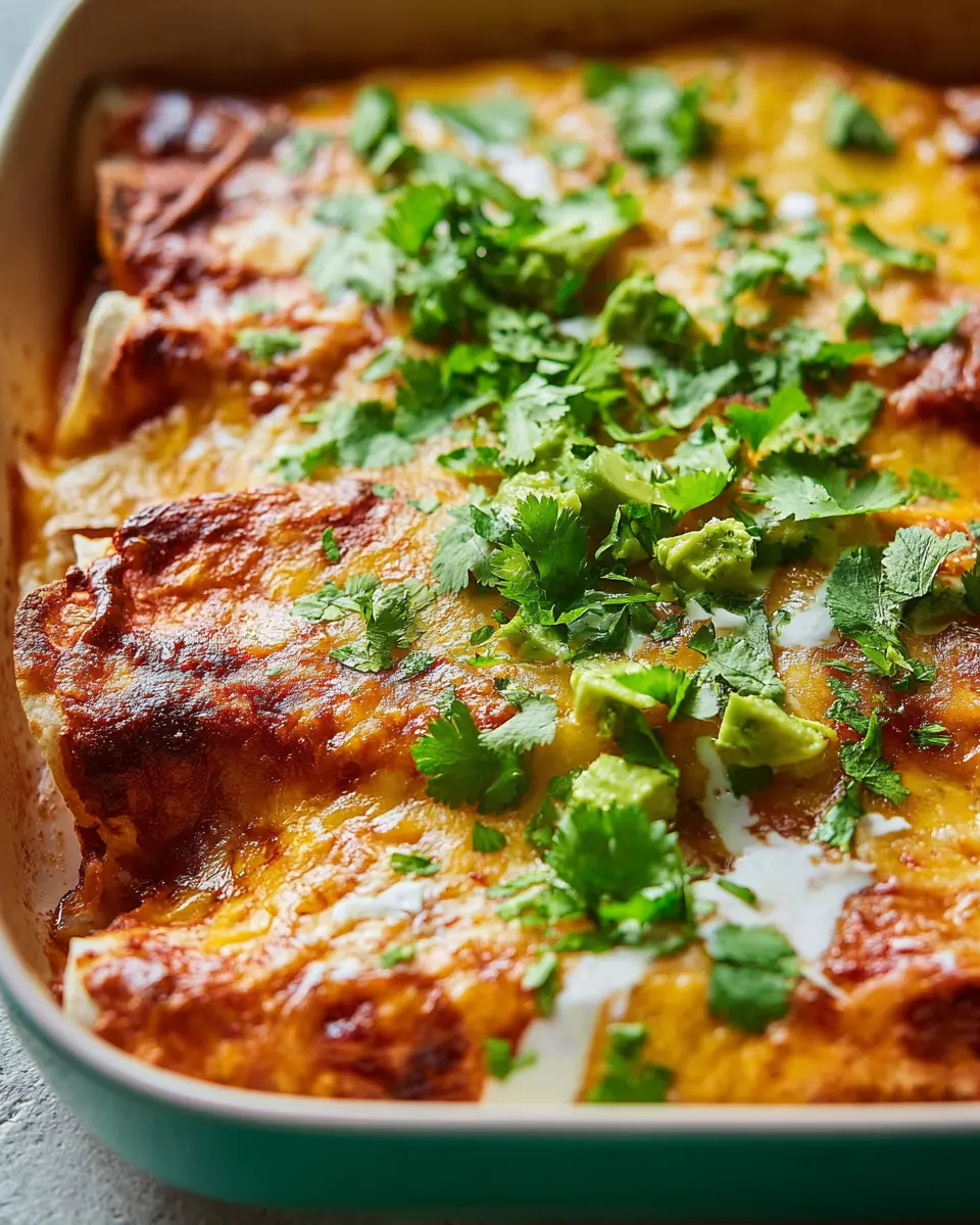While they’re baking, mix the sour cream with chipotle and a touch of water to create a delightful crema. Once the timer goes off, serve your enchiladas hot, topped with drizzles of crema, fresh cilantro, and avocado for a meal that’s simply irresistible!