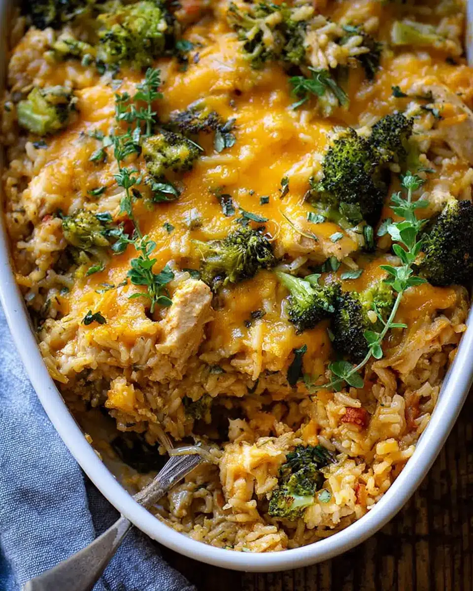 Voilà! Your broccoli cheddar chicken and rice casserole is ready to be served. A warm and comforting dish perfect for any occasion awaits you. Enjoy your meal!