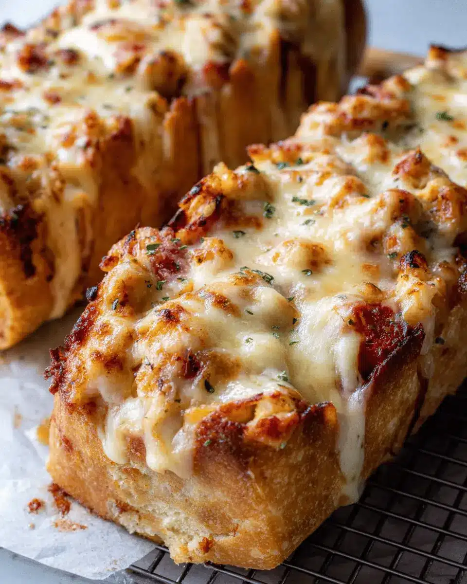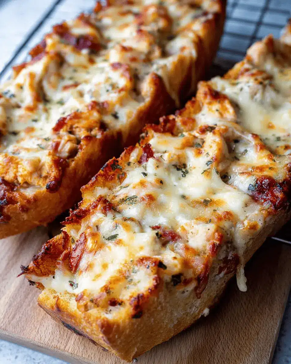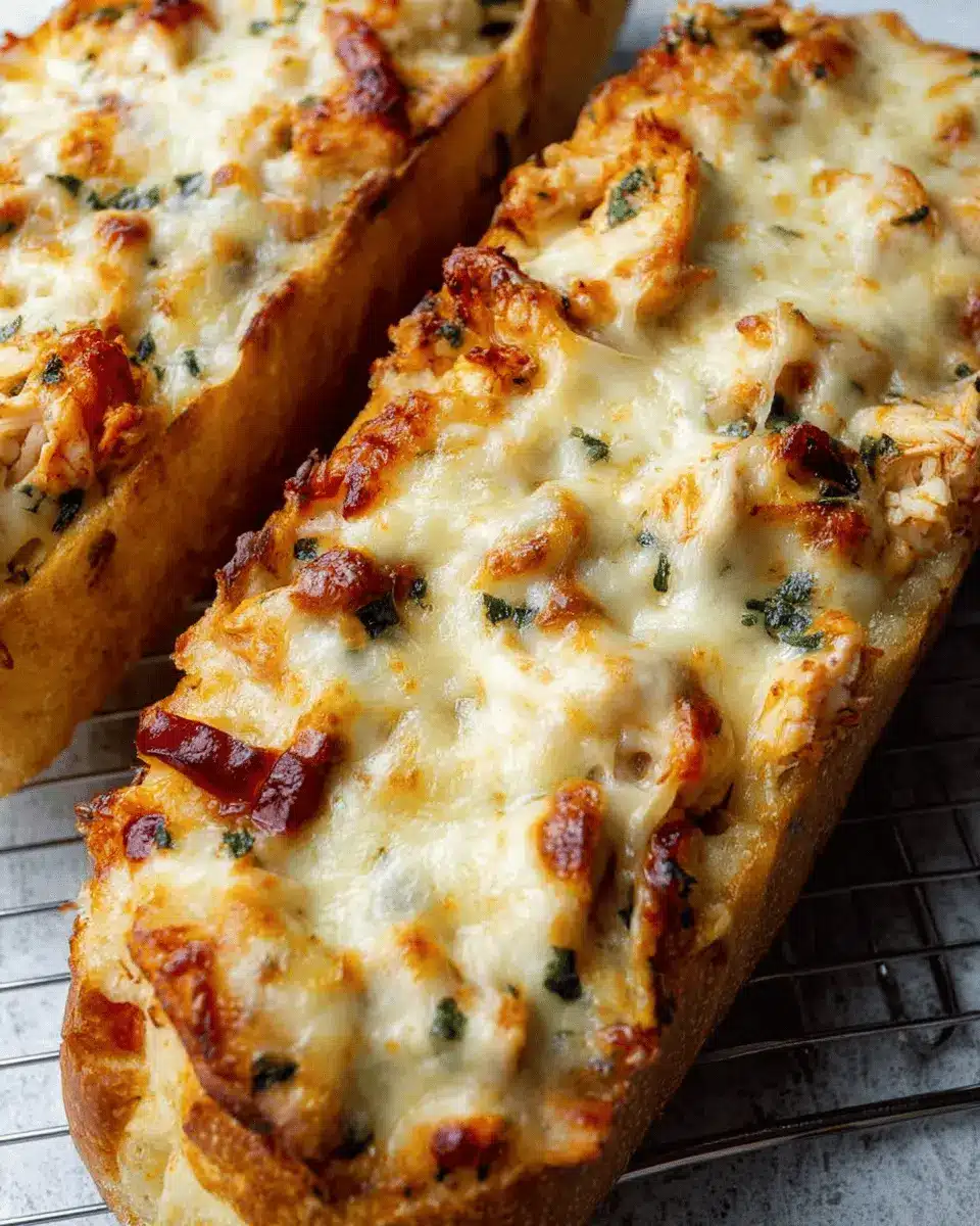 Once you pull them out, let the delicious Cheesy Chicken Garlic Bread cool slightly before slicing into manageable pieces. Serve it up for an unforgettable meal that will have everyone coming back for seconds!