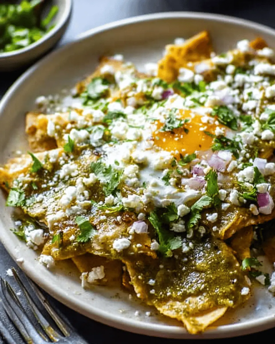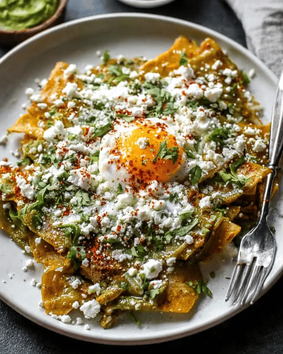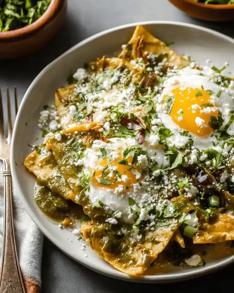 Elevate your Chilaquiles Verdes with thoughtful garnishes. Crumbled cotija cheese brings a salty creaminess that beautifully complements the tangy salsa. Freshly chopped cilantro adds a burst of color and flavor, while diced onions provide crunch. A dollop of sour cream or Mexican crema adds richness, and a perfectly fried egg makes it indulgent. Experiment with other toppings like sliced jalapeños for heat or avocado for creaminess—let your palate guide you!