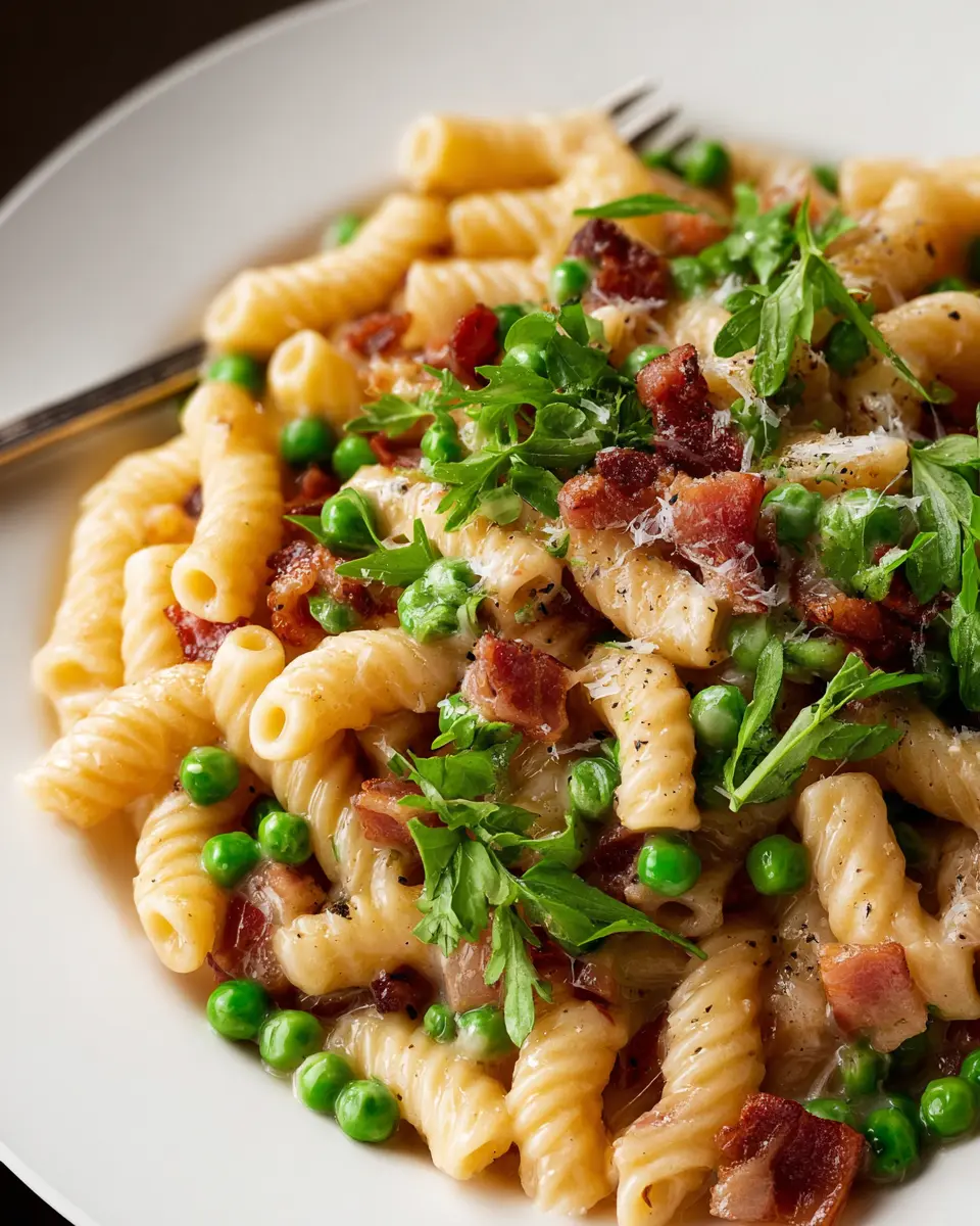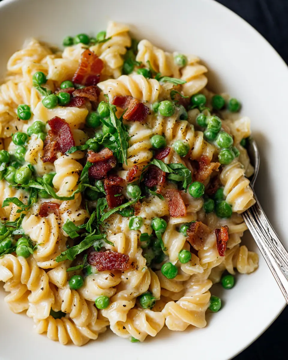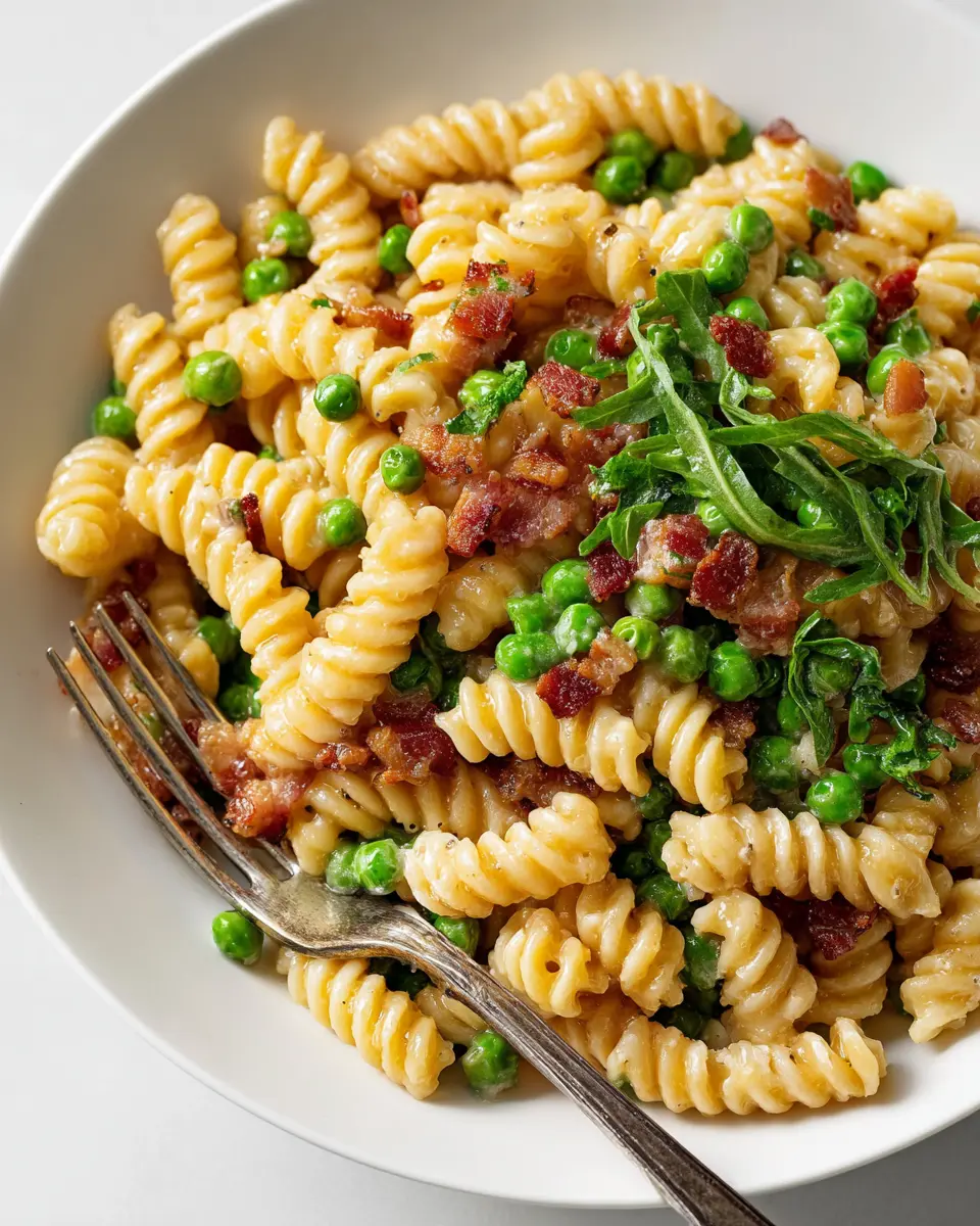 In summary, this creamy pasta with peas and pancetta dish is a delightful fusion of flavors that's perfect for any weeknight meal. With its rich creaminess balanced by fresh lemon and arugula, it's a quick, satisfying option that brings comfort and joy to your table. Enjoy every bite!