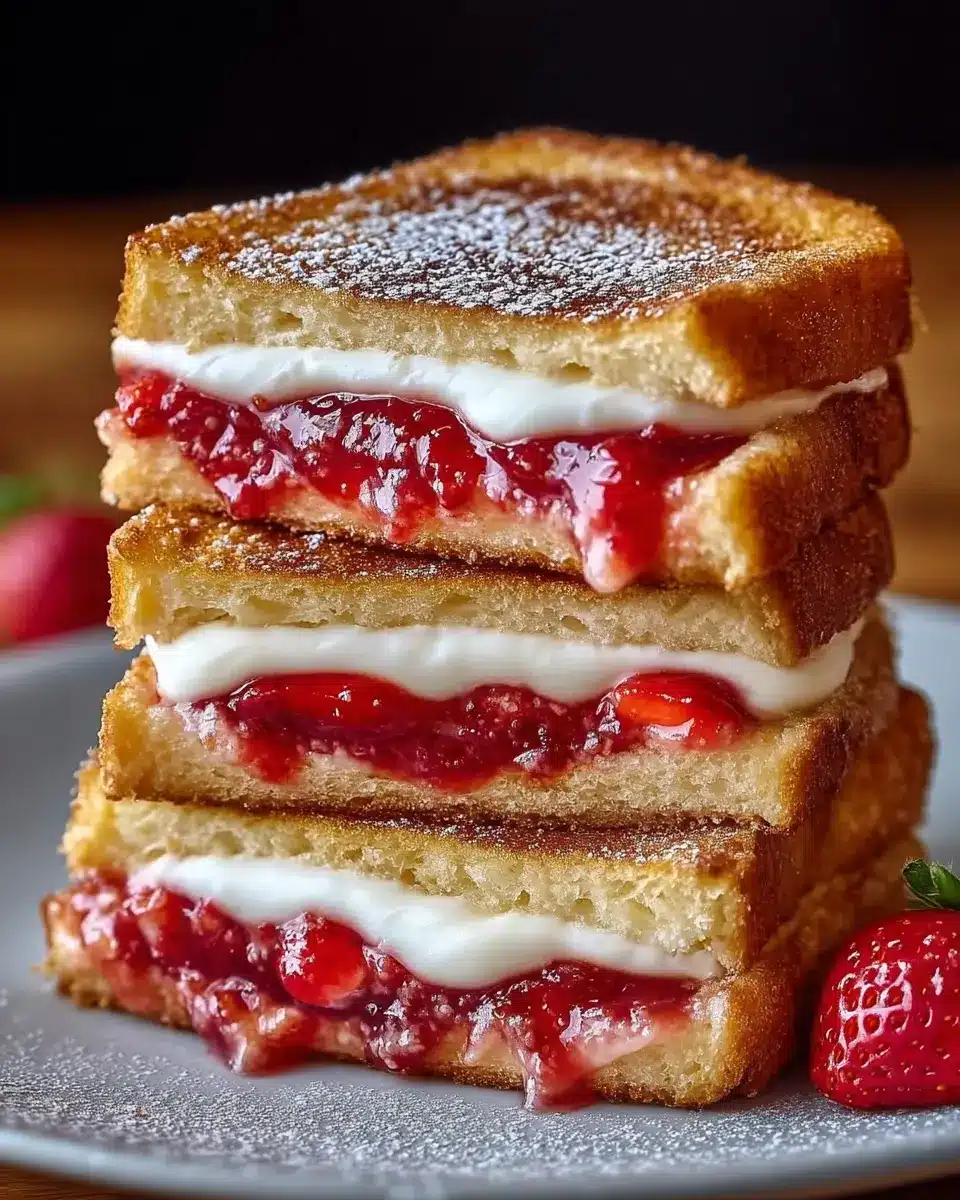 Finally, it’s time to bring it all together! Heat a large skillet over medium heat and add 1 tablespoon of butter. Once it’s melted and bubbly, carefully dip each sandwich in the egg mixture, making sure to coat both sides well. Place the sandwiches in the skillet, frying for about 2-3 minutes on each side, or until they’re beautifully golden brown. Once cooked, transfer to a paper towel-lined plate to drain off excess butter. A light dusting of powdered sugar right before serving adds a nice touch!