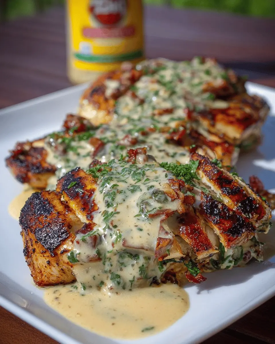 Elevate your serving presentation by slicing the grilled chicken into medallions, letting the stuffing peek out. Drizzle with the cream sauce for a gourmet touch. You can also serve it on a bed of quinoa or couscous, enhancing both texture and flavor. Finally, a sprinkle of fresh herbs like parsley or basil can add a pop of color and freshness, making your dish not just delicious but visually stunning too.