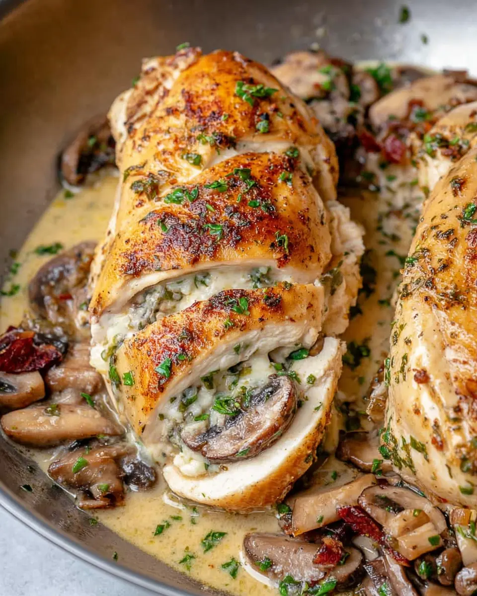 Cover the skillet and let everything simmer over low heat for about 12-15 minutes or until the chicken is cooked through (internal temperature should reach 165°F). Once ready, garnish with fresh parsley, and you’re set to serve a delightful Mushroom Stuffed Chicken Breast that’s bursting with flavor and charm. Enjoy your culinary creation with a fresh salad or side of your choosing!